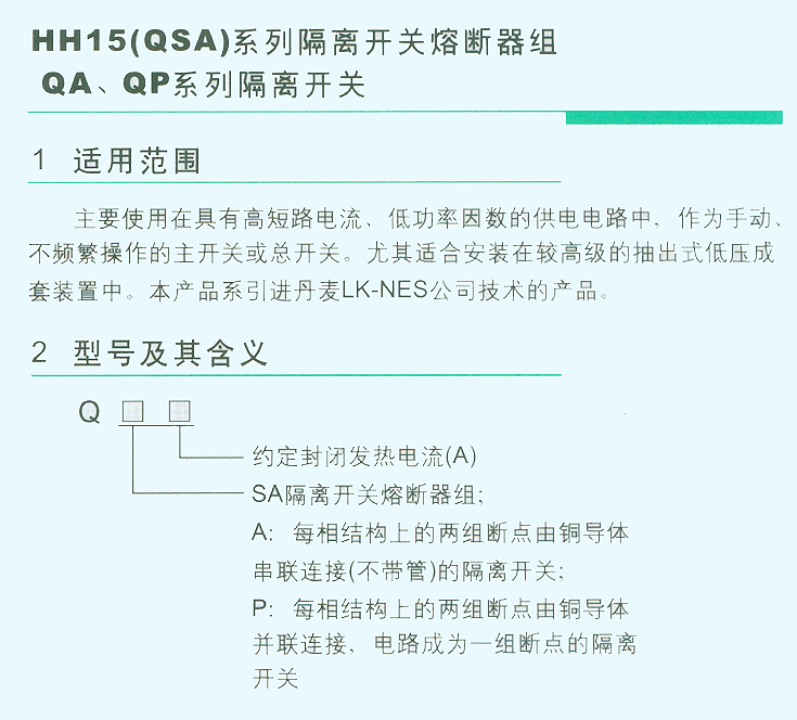 首頁 產品中心 低壓電器產品總匯系列 刀開關-負荷-隔離開關系列 HH15(QSA)系列隔離開關熔斷器組 QA、QP系列隔離開關